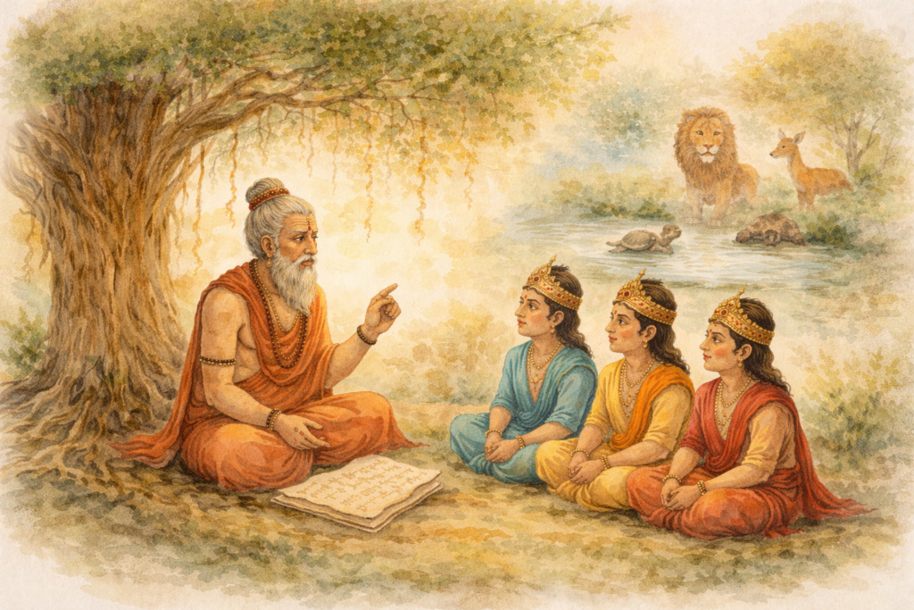 King Amarashakti, filled with hope, placed his sons under Vishnusharma’s care. And this began the creation of the Panchatantra, a collection of fascinating tales filled with wit, wisdom, and life lessons. Through these stories, the three princes learned the art of leadership, clever thinking, and practical wisdom. True to his word, Vishnusharma transformed them, and his tales have since been passed down for generations, teaching young minds across the world.