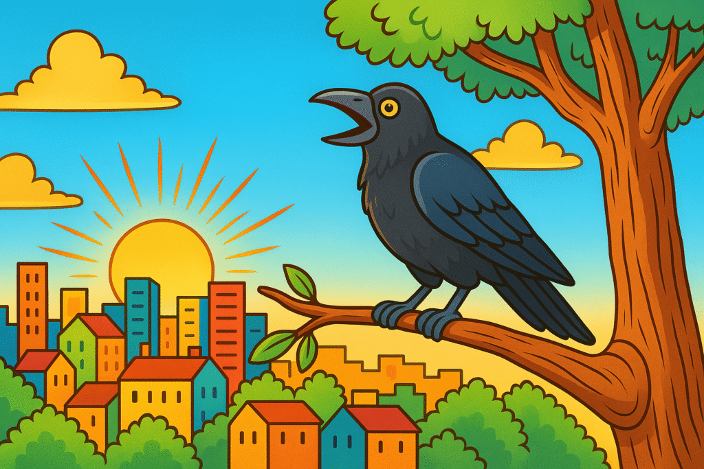 In a bustling city in the east of the country, there lived a crow on a big neem tree. The crow used to watch the world from the above every morning and felt very proud. But why? Every morning when the first rays from the sun touched the sky, the crow would happily flap its wings and let out a loud sound – “Caaw! Caaaw!”