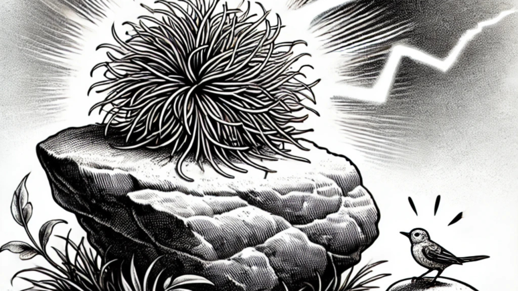 Many such days passed, and one stormy night, dark clouds gathered above. With a deafening roar, a powerful bolt of lightning struck the very rock on which the tinsel lay. The scorching heat from the strike burned the delicate tinsel, leaving it dull, shrivelled, and lifeless.